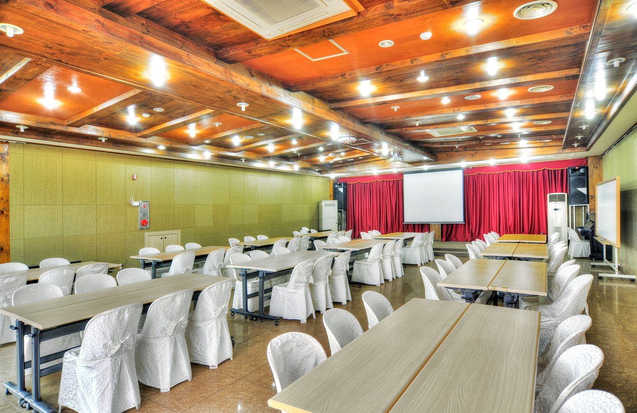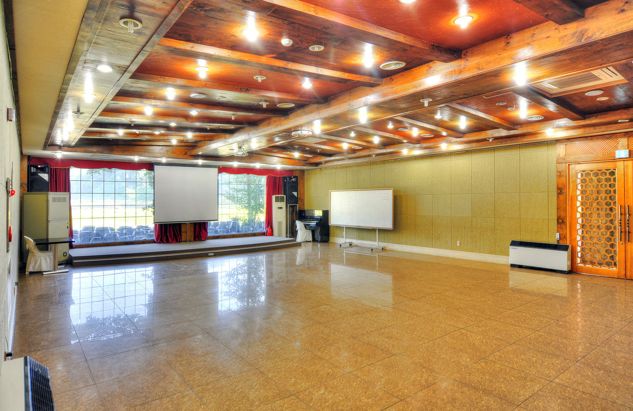 음향장비, 유선마이크 2개, 무선마이크 1개, 빔프로젝트, 레이저조명, 유무선인터넷, 에어컨, 온풍기, 단상, 직사각테이블, 의자